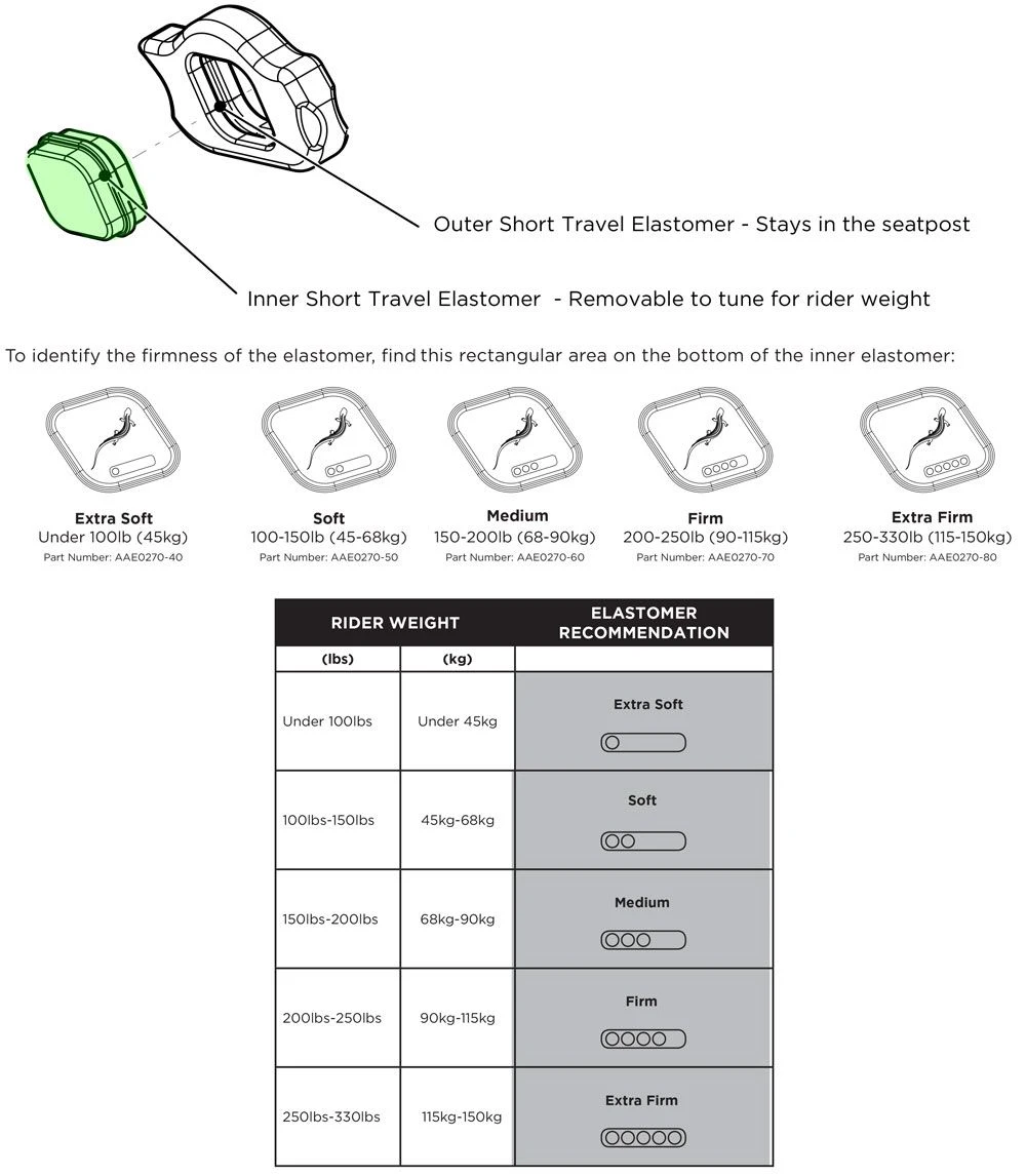 Con los elastómeros de Cane Creek puede ajustar su tija de sillín Thudbuster G4 ST al peso específico del ciclista y a la comodidad deseada en un abrir y cerrar de ojos gracias a los diferentes grados de dureza.