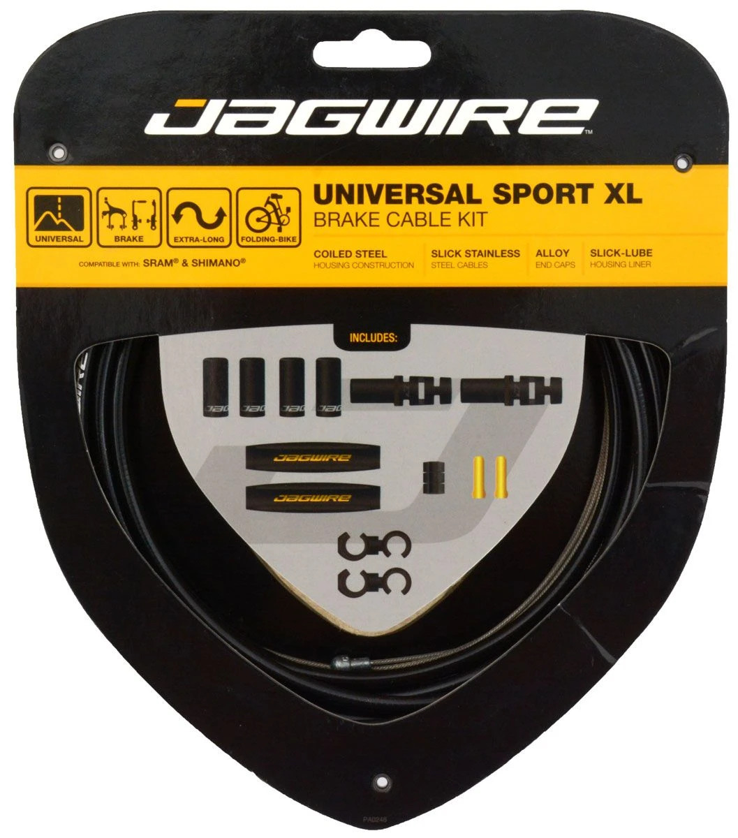 Los juegos de cables Jagwire Universal Sport XL para frenos contienen manguitos exteriores y cables extra largos.