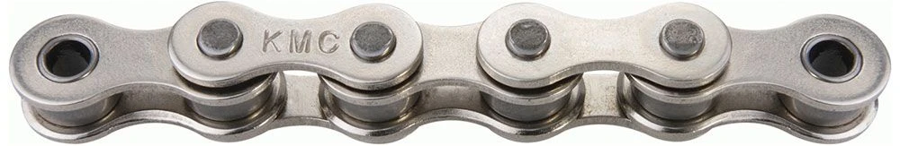 La cadena B1 Wide Singlespeed de KMC con superficie niquelada para BMX, sistema de engranajes de buje y otros sistemas de una sola velocidad que requieren una transmisión de potencia directa.