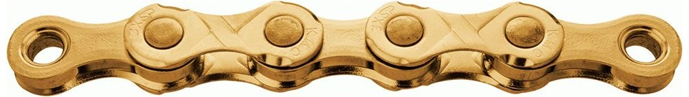 La cadena de 12 velocidades e12 Ti-N de KMC, extremadamente duradera, sin dependencia del sentido de la marcha y con un revestimiento superficial de oro de nitruro de titanio, para bicicletas eléctricas con sistema de cambio de 12 velocidades.