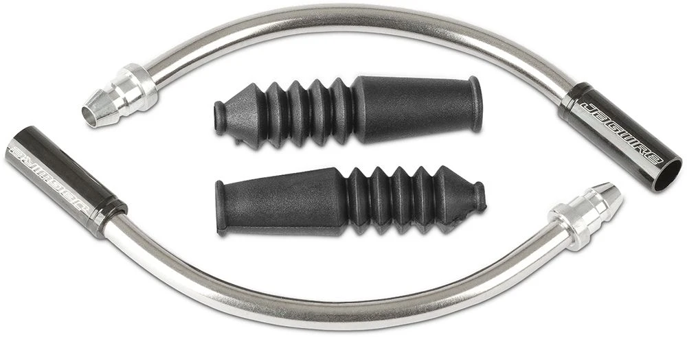 El juego de guía de cable/manguito exterior RFR V-Pipe 90° para el sistema de freno V-brake (rueda delantera + rueda trasera) protege la horquilla/el bastidor de arañazos. La guía de cable/manguito exterior se puede montar fácilmente en el cable de freno y en el cable de cambio.