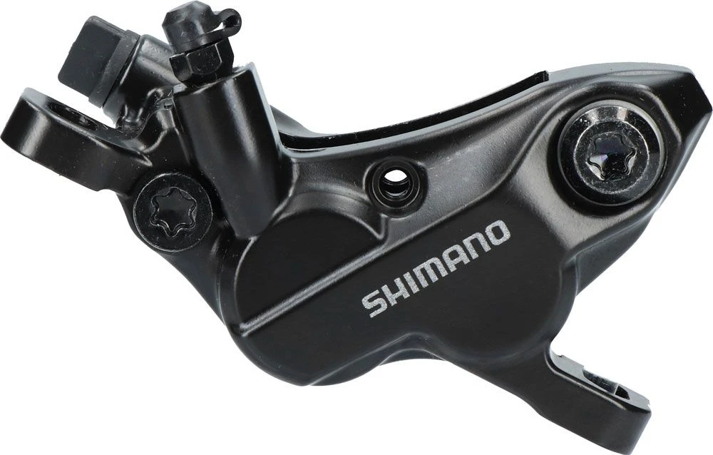 La pinza hidráulica de 4 pistones Shimano BR-MT520 para rueda delantera o trasera con montaje en poste y pastillas de disco de resina D01S.