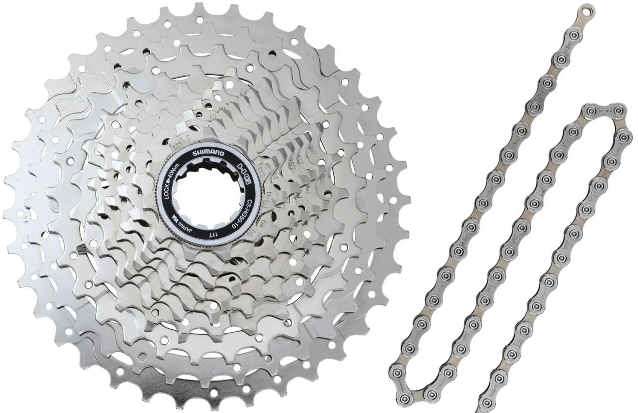 Juego de desgaste para transmisión Shimano de 10 velocidades compuesto por el casete CS-HG50 en la gradación 11-36 y la cadena DEORE CN-HG54 con 116 eslabones.
