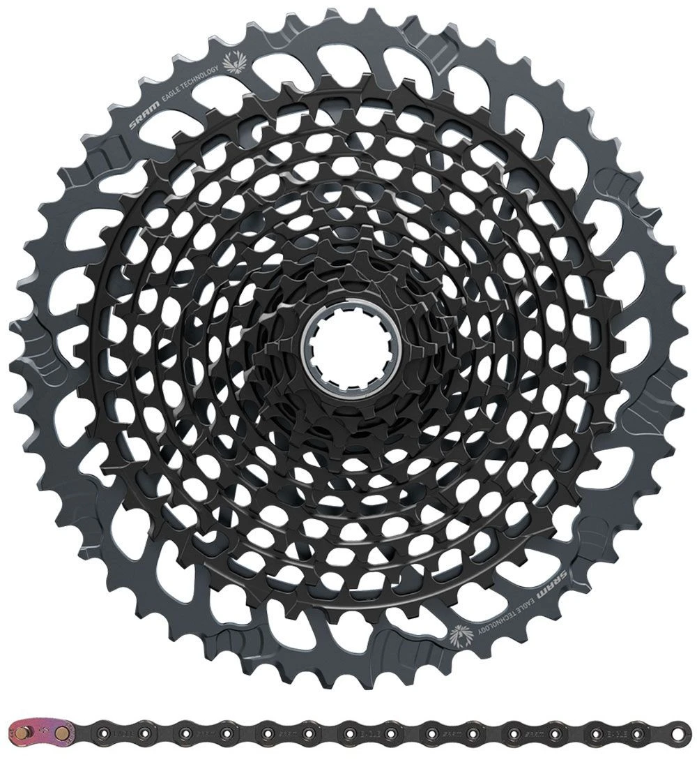 Kit de desgaste para la transmisión Eagle de 12 velocidades de Sram que consiste en el casete X01 Eagle XG-1295 con 10-52 dientes y la cadena XX1 Eagle con 126 eslabones.