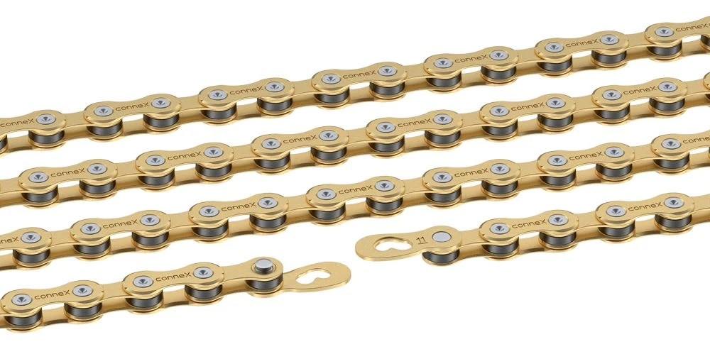 Ya sea en bicicleta de montaña, de carretera o de grava, la cadena Wippermann Connex 11SG de 11 velocidades brilla por su durabilidad, por su limpio rendimiento de cambio y, naturalmente, por su superficie dorada.